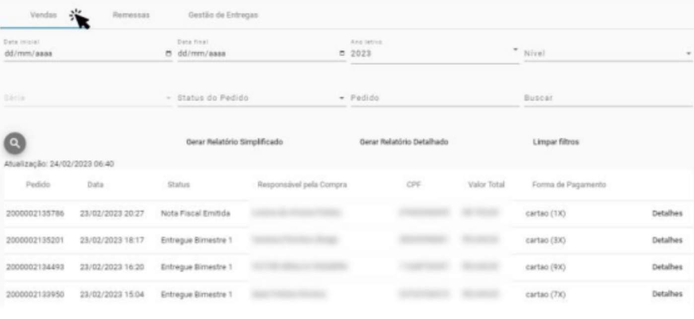 Acesse a aba “Vendas”, onde são apresentados todos os pedidos realizados pelos responsáveis e preencha no campo aberto “Buscar” os termos que podem ajudar na localização do pedido, como por exemplo o nome do responsável, nome do aluno, CPF do responsável e entre outros.